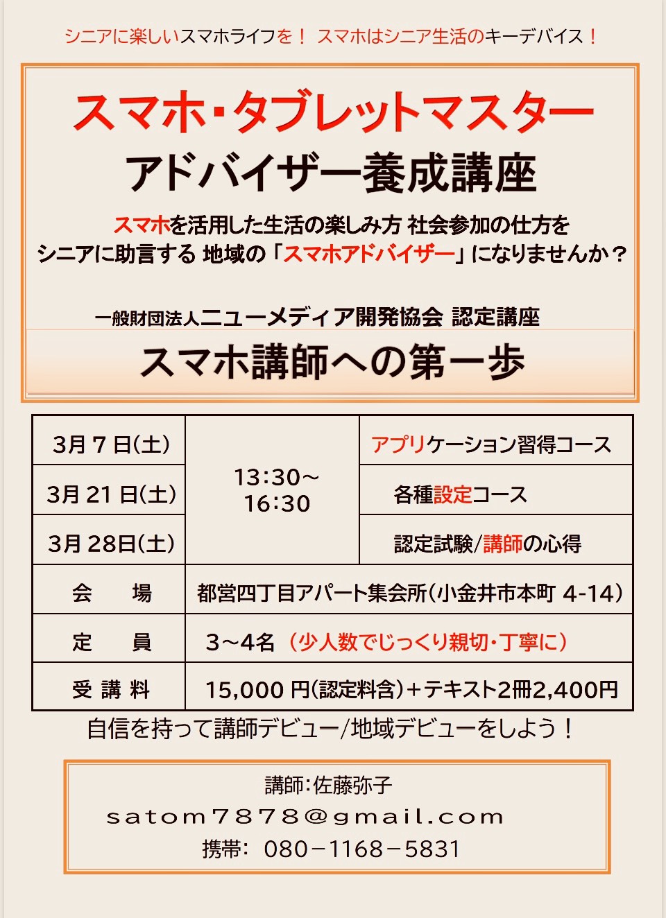 スマホを活用した生活の楽しみ方、社会参加の仕方をシニアに助言する地域の「スマホアドバイザー」の養成講座です。